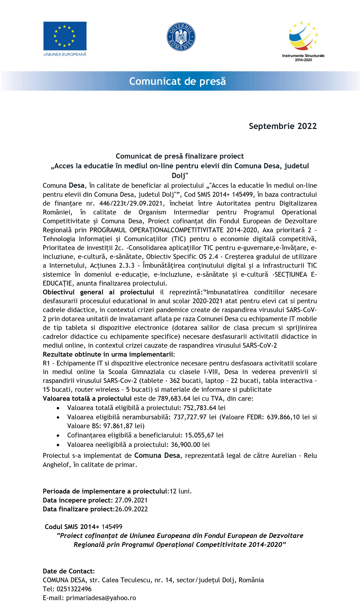 4. Comunicat de presa “Acces la educație în mediul on-line pentru elevii din Comuna Desa, județul Dolj”